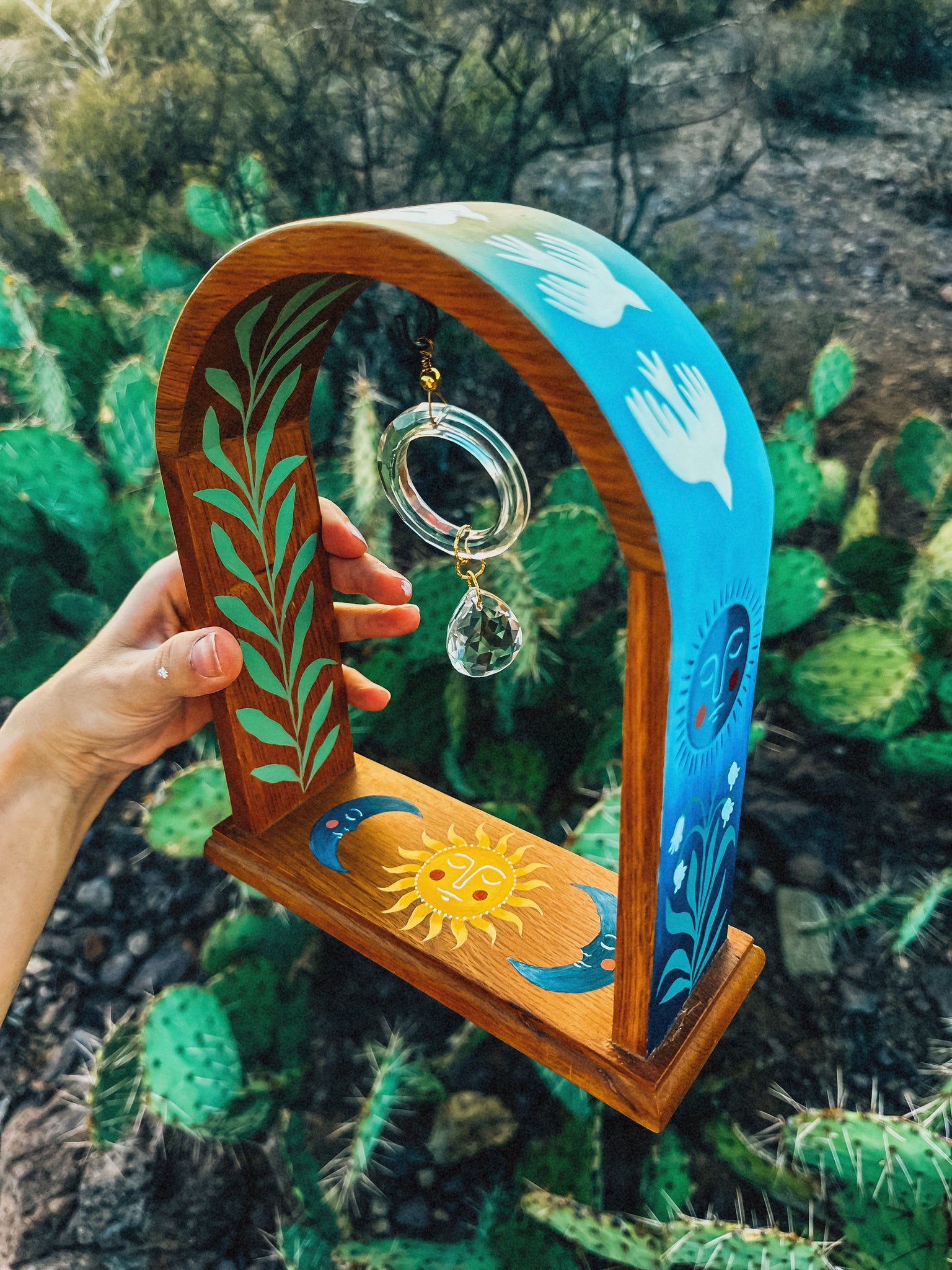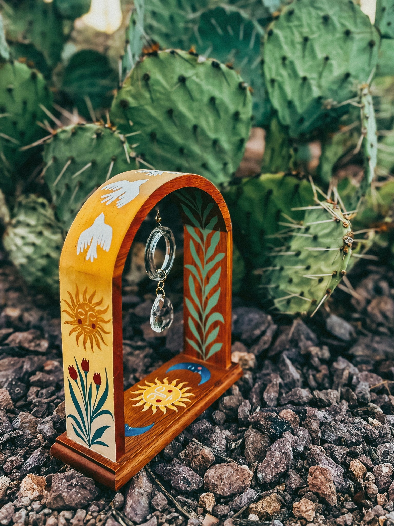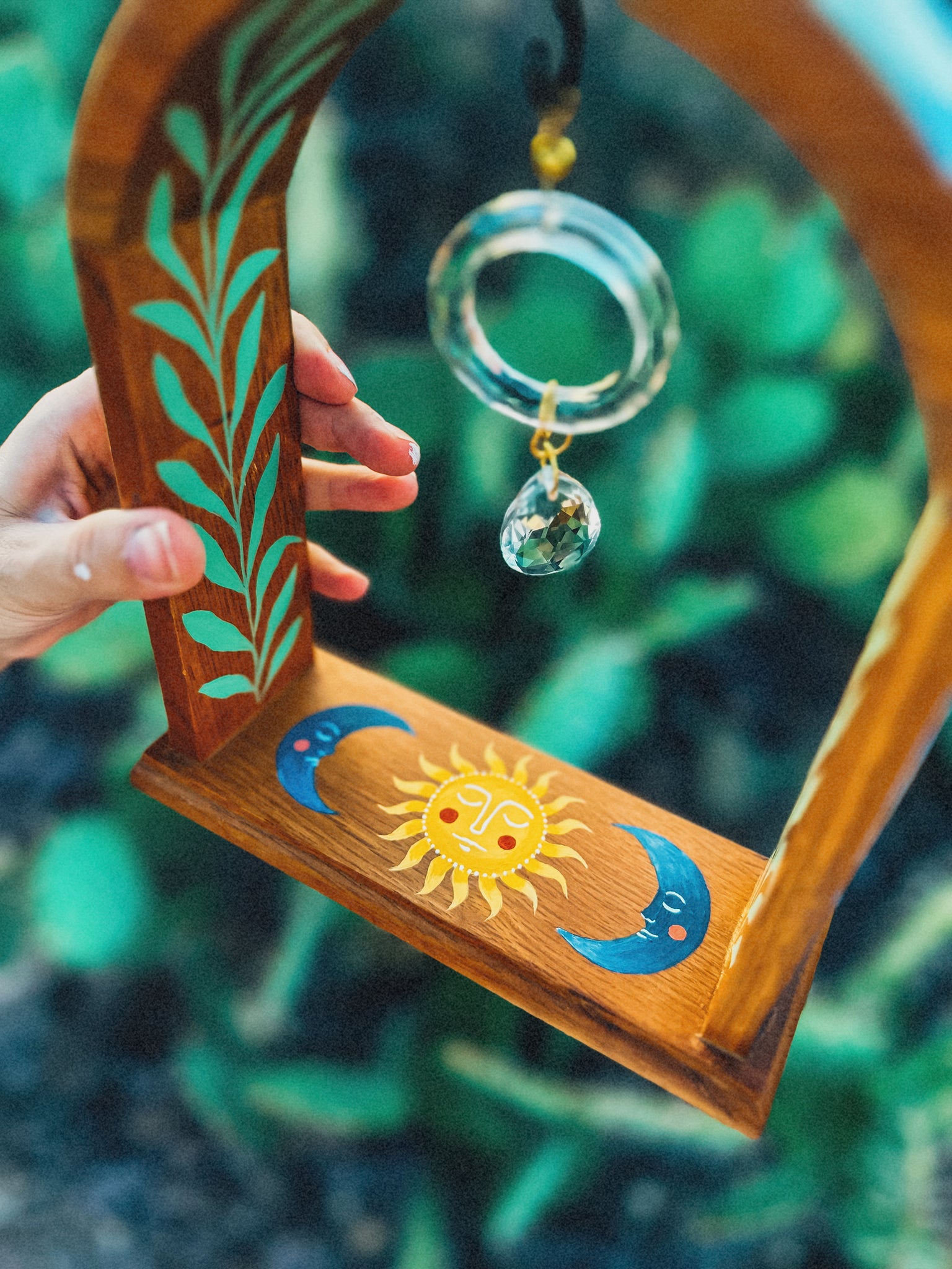 The wooden arch includes a shimmering glass prism that catches the light beautifully, casting soft rainbows and reflections wherever the sun reaches (would be so beautiful on a window ledge).