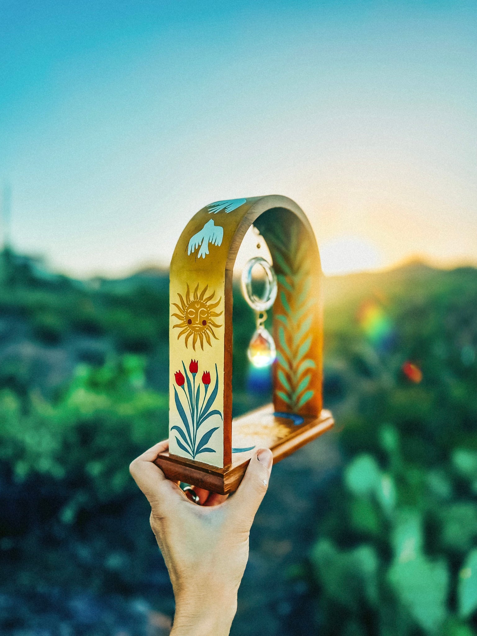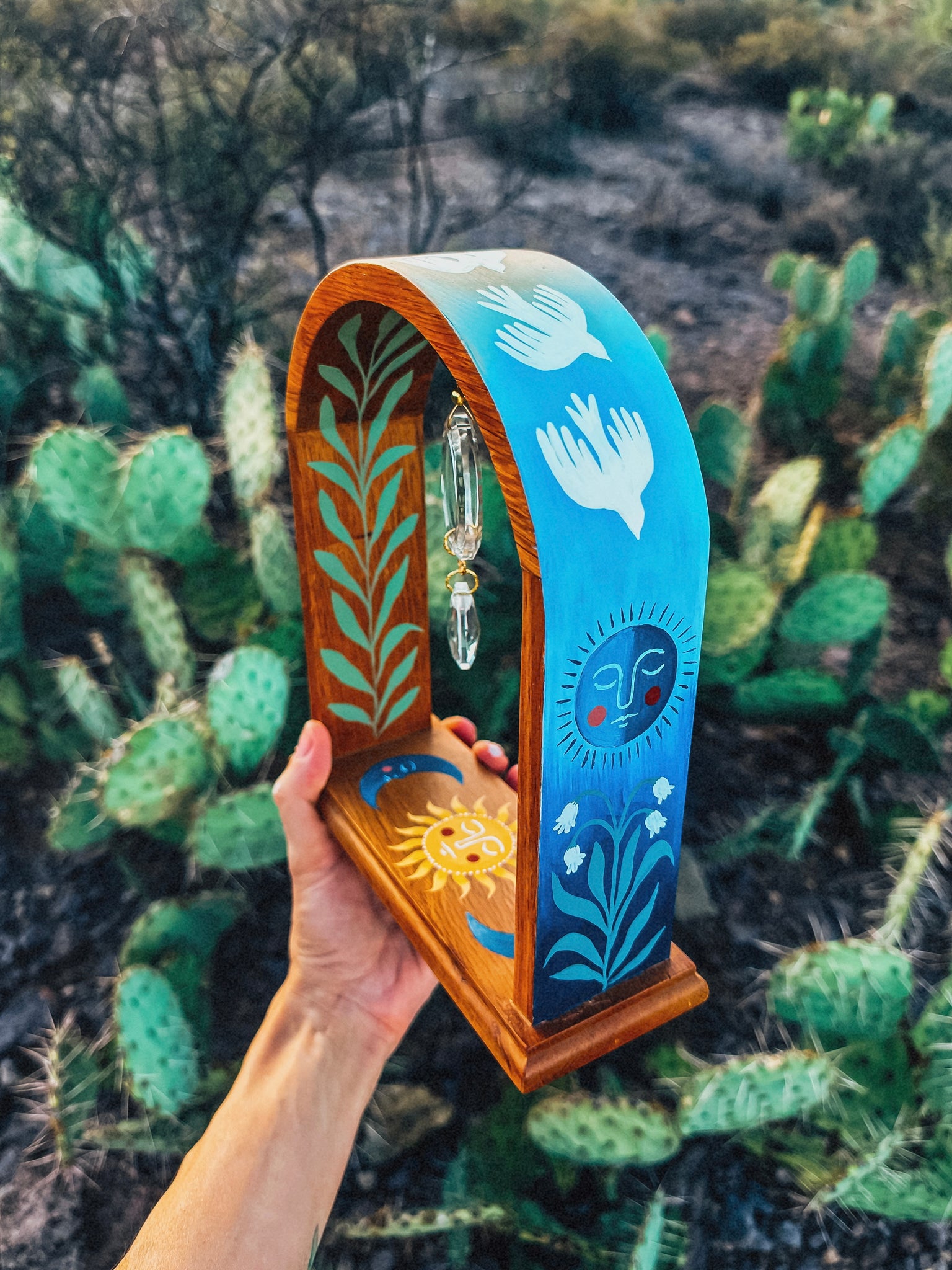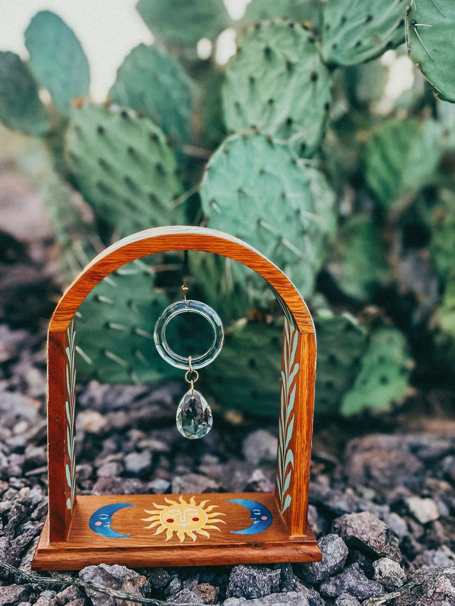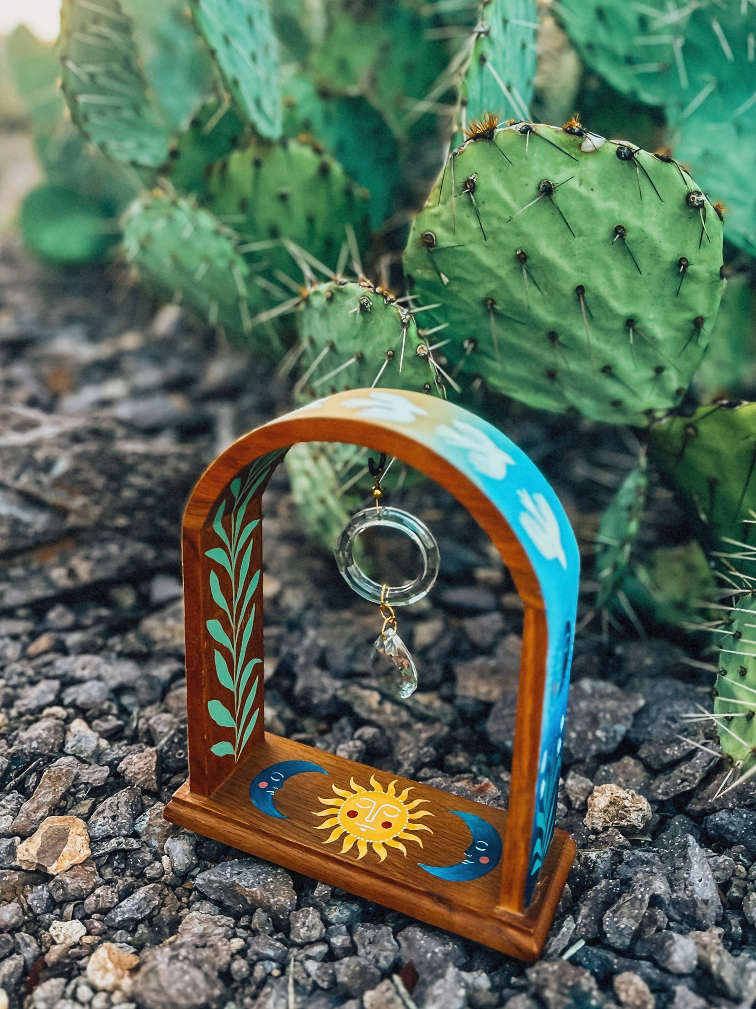 The wooden arch includes a shimmering glass prism that catches the light beautifully, casting soft rainbows and reflections wherever the sun reaches (would be so beautiful on a window ledge).