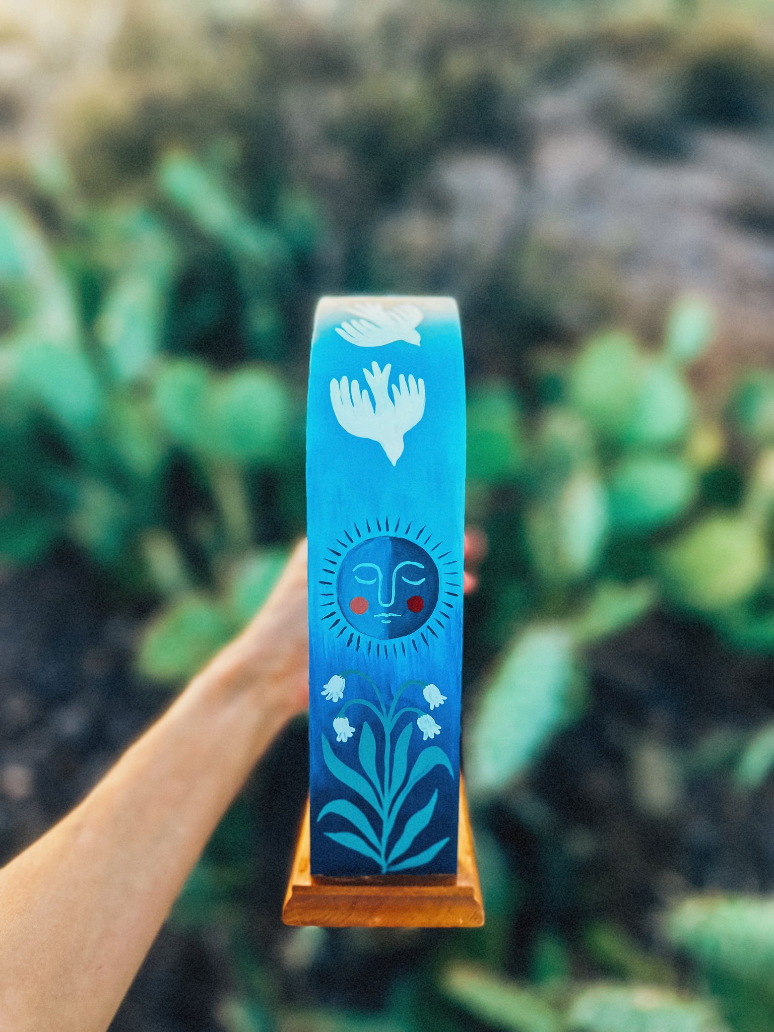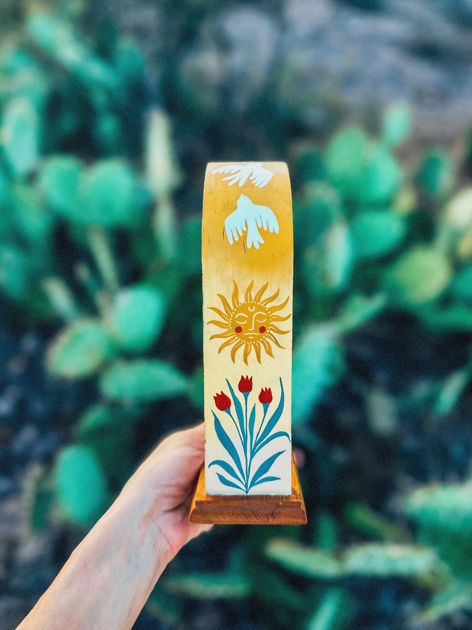 Bring a touch of desert sunlight and celestial charm into your home with this hand painted vintage arch. This piece was carefully restored and adorned with a whimsical folk art sun and moon design.